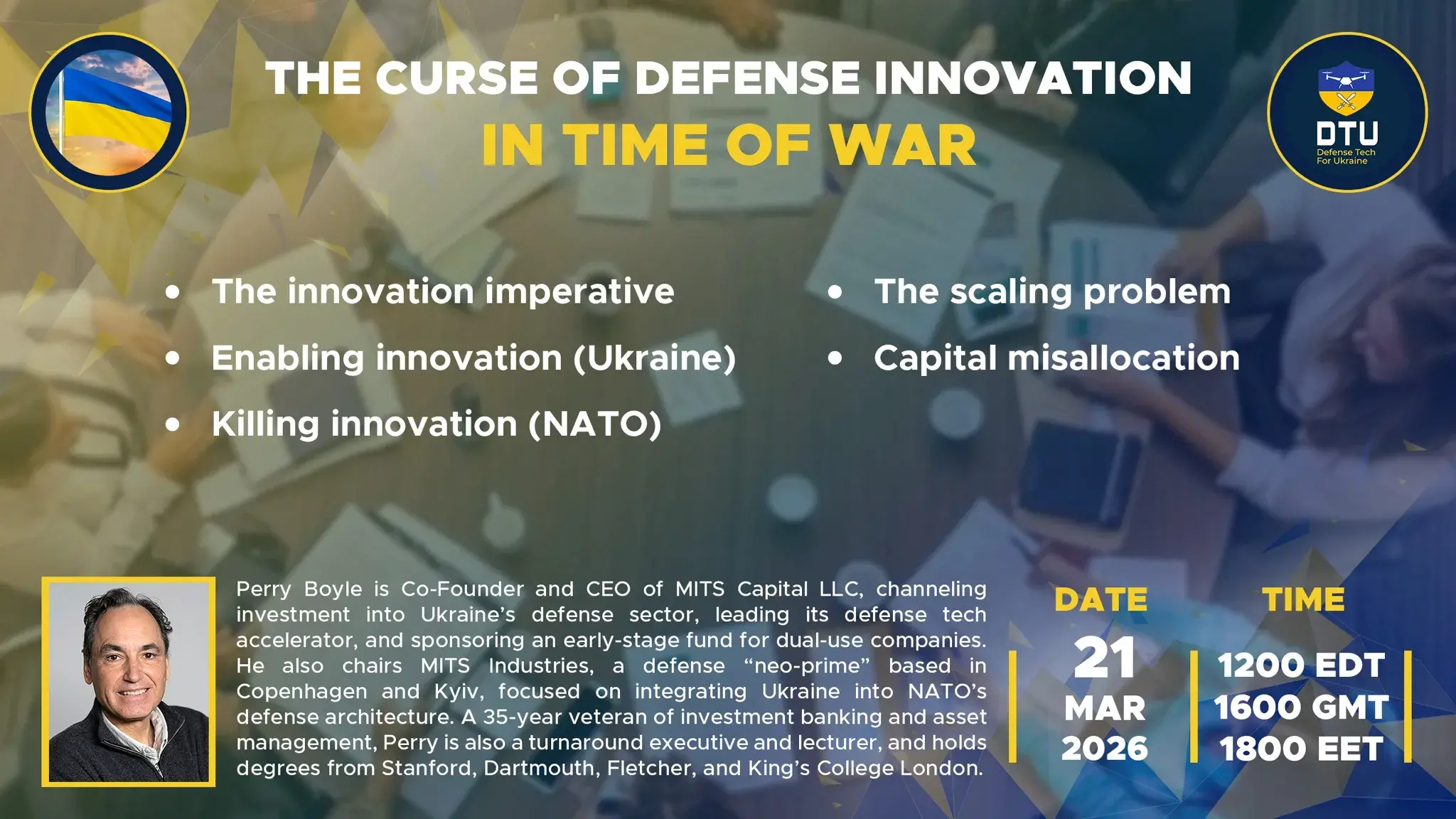 Perry Boyle is Co-Founder and CEO of MITS Capital LLC, channeling investment into Ukraine’s defense sector, leading its defense tech accelerator, and sponsoring an early-stage