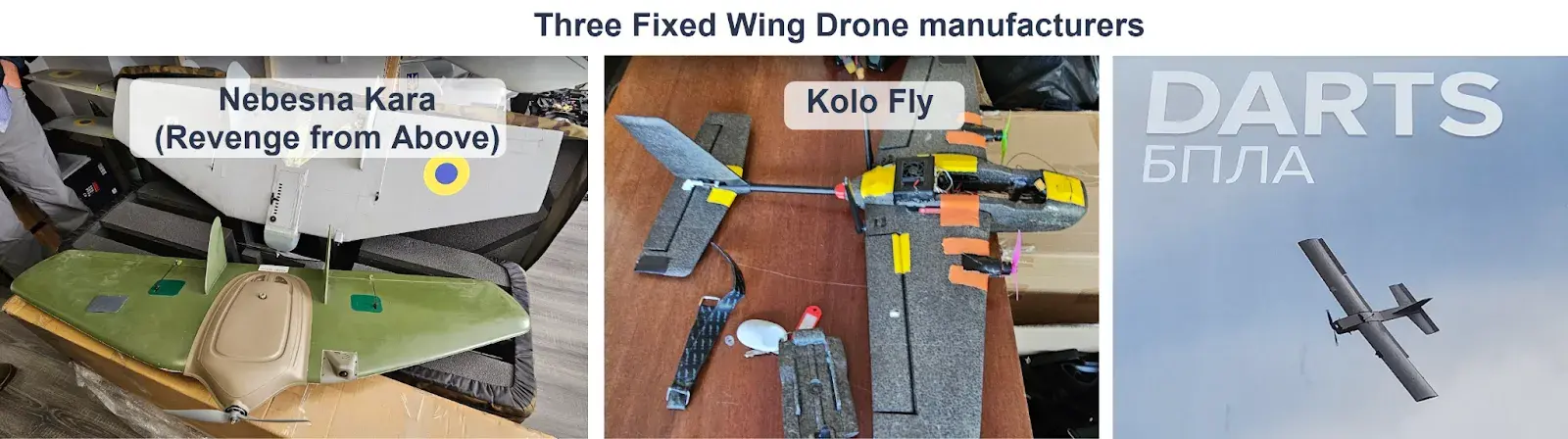 - Shared innovative fixed-wing drone technology amongst three disparate Ukrainian fixed-wing drone manufacturers who are not previously communicating. Each factory produces fixed-wing drones that have pros and cons to their designs. In connecting the owners/managers of the three manufacturers, the production lines of all three should improve in quality and quantity.